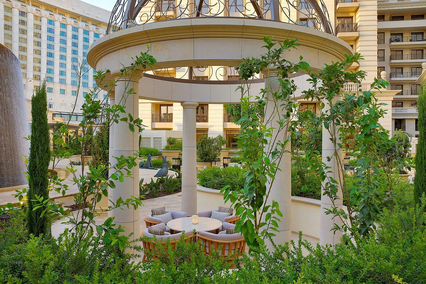- Two specialty restaurants, all-day dining, spa, external gardens, and pools